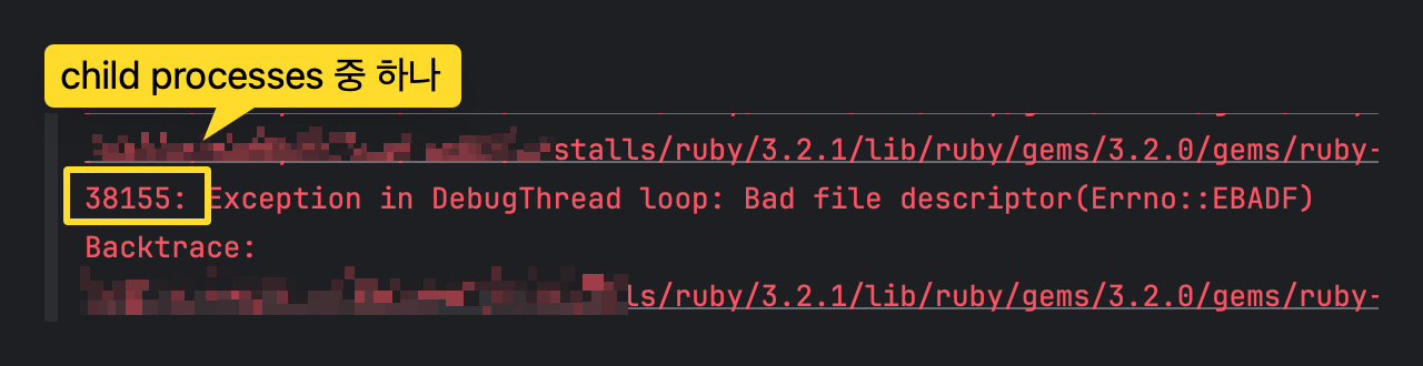그런데 puma 서버에 http request 를 보내면, master process 가 요청을 처리하지 않고 child processes 중 하나가 처리하게 되는데(위 스샷에서는 PID 38155) 이 process 입장에서는 연결된 debugger 를 찾을 수 없으니(File Descriptor 를 이용해서 찾나 봄) 이런 오류가 발생하게 된 것으로 보인다.