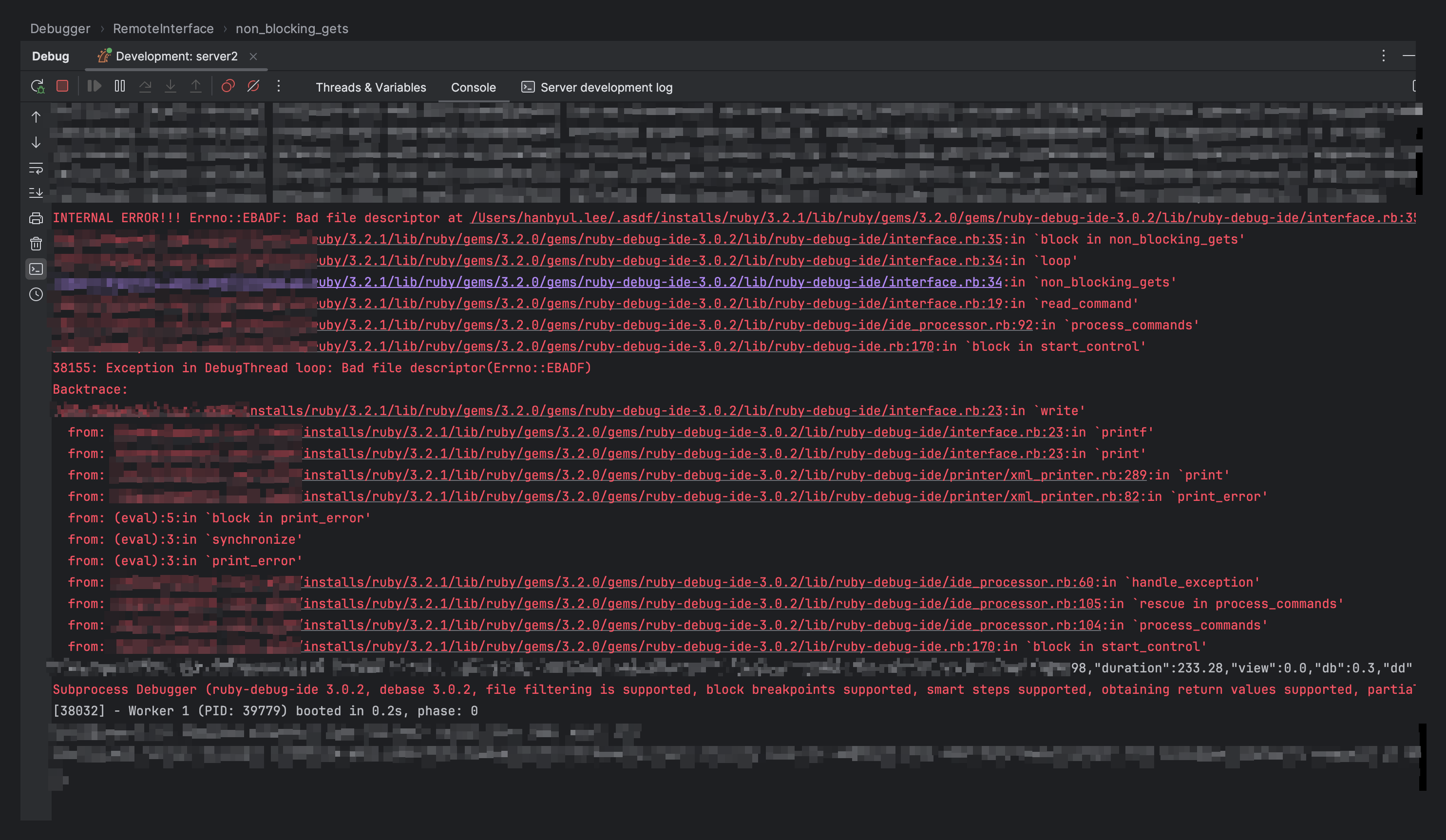 Rubymine 에서 개발을 하다가 debug 모드로 실행하고 break point 걸어서 보려고 하면 Exception in DebugThread loop: Bad file descriptor(Errno::EBADF) 이런 오류가 발생하면서 안 되는 경우가 있다.